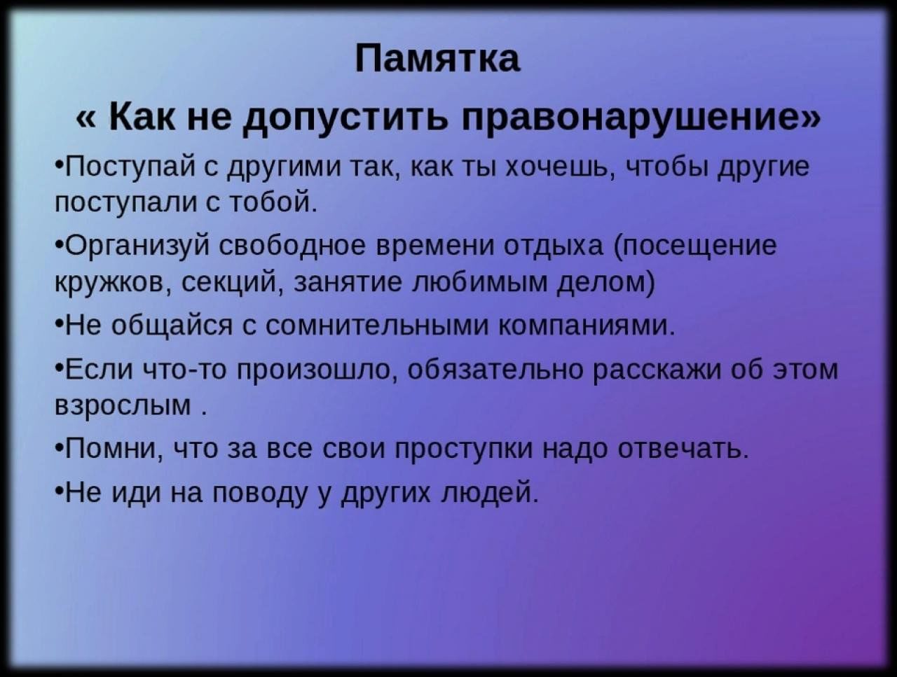 Профилактика правонарушений среди несовершеннолетних в школе осуществляется на основании закона РФ «Об основах системы профилактики, безнадзорности и правонарушений несовершеннолетних» № 120-ФЗ. В соответствии с ФЗ образовательная организация: выявляет несовершеннолетних, находящихся в социально опасном положении, а также не посещающих или систематически пропускающих по неуважительным причинам занятия в школе, принимает меры по их воспитанию и получению ими общего образования, выявляет семьи, находящиеся в социально опасном положении, оказывает им помощь в обучении и воспитании детей.