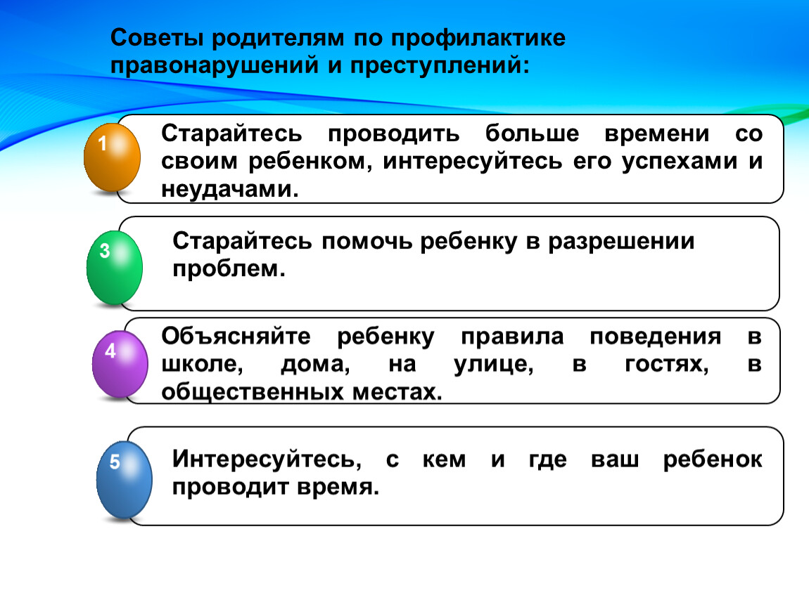 Вопросы профилактики правонарушений рассматриваются на педсоветах, заседаниях МО классных руководителей, Совете по профилактике правонарушений и безнадзорности, родительских собраниях.